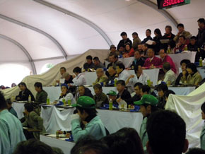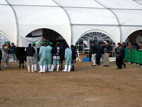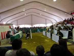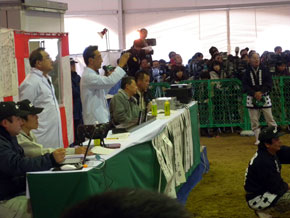 第59回松阪肉牛共進会が、平成20年11月30日(日曜日)に松阪市内の農業公園ベルファーム特設会場で開催されました。 この日は、予備審査を通過した松阪牛50頭が早朝から会場入りし、最終の審査に臨みました。 審査委員長の三重県畜産研究所の森昌昭主幹研究員らが牛体形や肉付きのようす、毛並みなどを審査した結果、多気町の松本しのぶさんが出品した「としのぶ号」が「優秀一席」の栄冠に輝きました。 女性の飼育者が優秀一席に輝くのは59回の共進会史上初めてのことです。 午後から行われたセリ市では、この牛を津市の精肉店朝日屋が1,500万円という昨年の最高額より300万円高い価格で競り落としました。(「としのぶ号」は平成17年3月生まれで、体重656キロ、体高128センチ。父は「菊俊土井」、母の父は「谷福土井」) また、相可高校の生徒たちが肥育し出品した「きくみつふく号」は、松阪市の精肉店瀬古食品が、510万円の高値で買い取りました。 |