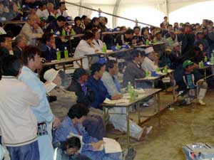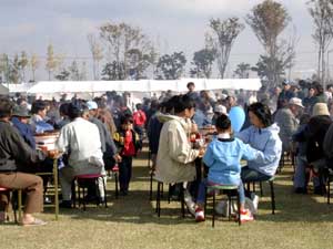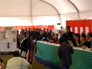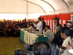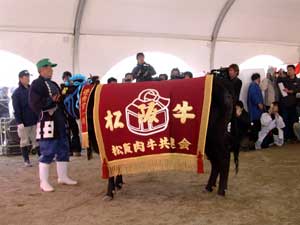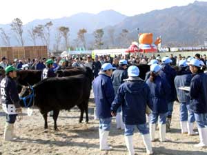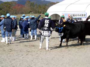 平成16年11月26日(金)〜28日(日)に松阪インター近くの農業公園ベルファームで松阪牛まつりが盛大に行われました。 お祭り会場では、地元名店による焼肉コーナーを始め、関係市町村の特産品販売コーナーや子供の広場なども大賑わいで、あちらこちらで行列ができていました。 28日には、第55回松阪肉牛共進会も開催され、大宮町の岡田一彦さんが出品した「まるふじ」号が優秀賞1席の栄誉に輝き、共進会の後で行われたせり市では、2005万円の値が付けられました。 なお、同2席には飯南町の森本武治さん「ふくこ」、3席には、玉城町の浦田修さん「ゆきてる」、4席には多気町の松本しのぶさん「ゆたか」が入賞されました。 |