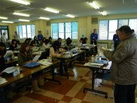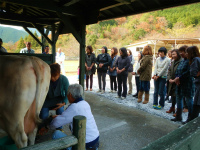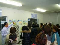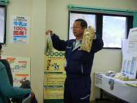 平成24年11月30日(金曜日)、大紀町の大内山酪農ふれあい牧場を主会場として、酪農体験研修会が開催されました。 この研修会は、搾乳体験やバターづくり体験、牛乳工場の見学等を通じて、酪農や牛乳・乳製品について、理解を深めてもらうことを目的に開催されたもので、県内各地から学校栄養教諭やPTAの皆さん等24名の出席がありました。 ふれあい牧場では、乳搾り体験がありました。酪農協の職員の方から乳頭の握り方、力の入れ具合を聞いて、さっそく搾乳体験。体験のお相手は、体格も小さめで性格もおとなしいジャージー種の牛でした。参加者の皆さんは初めての体験ということで興味津々のようすでした。 続いての体験は、「加工」。 バターづくりです。こちらも職員の指示によって、瓶を振って汗をかきながらの体験になりました。「振ることによって、脂肪同士がぶつかって、かたまりに・・・」と理屈を納得しつつ、自分の手の中でバターに変身していくようすを楽しんでもらえたようです。 会場を酪農協の生乳工場に移し、生乳の流れに沿って牛乳等に加工されていく工程を見学しました。 これらの体験を通して意見交換会では、「季節による乳質の変化」「牛乳とは」「殺菌の方法」「乳牛の一生」等について質疑応答がありました。 |