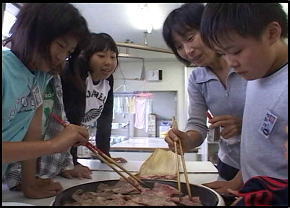 松阪牛の肉を食べてみよう。 輸入牛肉と食べ比べをしてみる授業です。 子供たちもうれしそうです。 見た目は?食べた感想は? この肉になる牛はどんな牛かな? どんな人がどんな育て方をしたのだろうか?・・・学習の開始です。 |