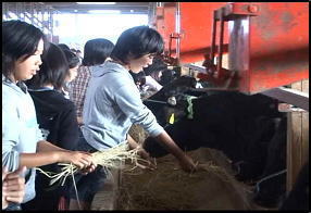 大規模牧場の肉用牛肥育農家では、肥育農家の仕事や牛を飼う苦労を感じ取りました。 牛のえさやり体験では、この牛がやがては肉になるのかと考えさせられました。 |