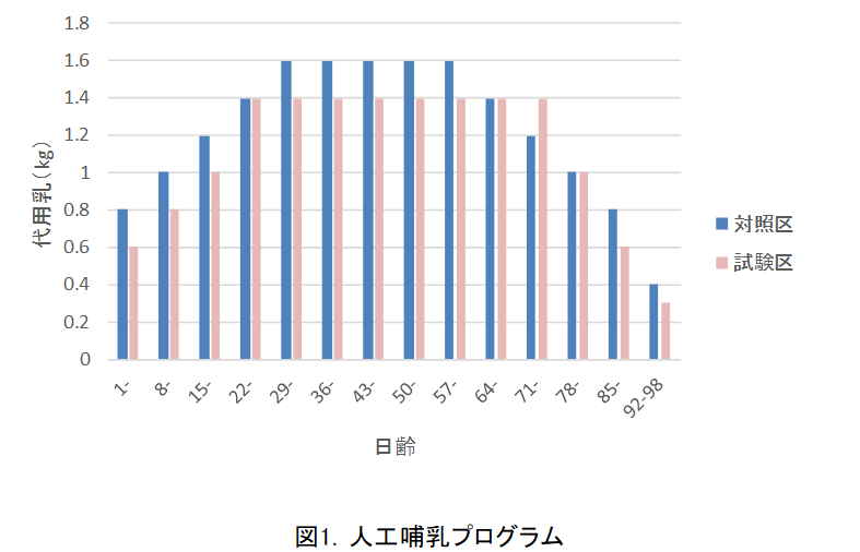 受精卵移植により出生した黒毛和種雄子牛について、人工哺乳プログラムの違い(図1)が哺乳期から離乳期の飼料摂取量と発育に及ぼす影響を検討しました。3-4ヵ月齢のスターター摂取量は試験区が対照区より有意に多くなりました(図2)。 | |