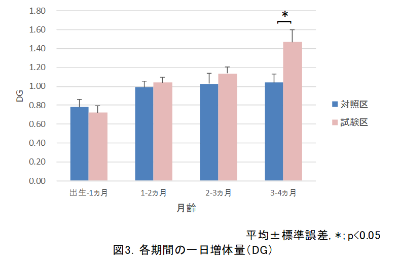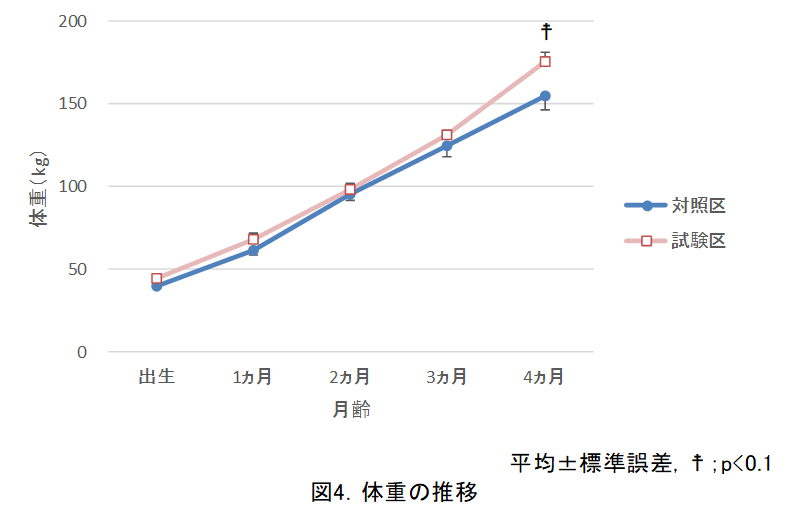 3-4ヵ月齢の一日増体量(DG)は試験区が対照区より有意に高くなり(図3)、4ヵ月齢の体重は試験区が対照区より約20kg大きくなりました(図4)。 | |