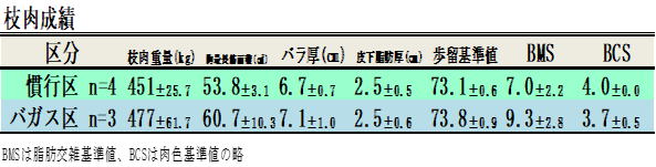 繊維が多く嗜好性の良い発酵バガス(サトウキビの搾りかす)を稲わらの一部代替(代替量=500g/日/頭)として利用することで、粗飼料(稲わら+発酵バガス)を安定して摂取させることができました。それに伴い濃厚飼料摂取量も多くなり、枝肉重量等の格付け成績も向上しました。