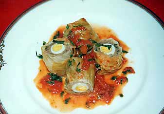 1 茶を200ccの水で戻す。パン粉を牛乳でふやかす。 2 玉葱をみじん切りして、フライパンにバターを入れて炒めて冷ます。 3 ウズラの卵を湯がいて、殻をむく。 4 牛ミンチを練り、戻した茶(1/3)とパン粉に冷ました玉葱の1/2を混ぜ、更に練り、塩・胡椒で味付けする。 5 キャベツを塩湯がきして、冷水に落として水気を切る。ウズラの卵と牛肉を巻く。 6 鍋底に(5)のロールキャベツを敷き詰めて茶の戻し汁と戻した茶(1/3)とカットトマト、コンソメキューブ、ローリエ、玉葱を入れて30分ほど煮る。 7 煮たら半分に切り、残りの茶と共に盛り付ける。 |