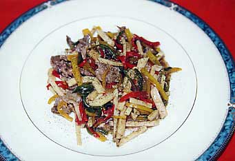 1 白葱はみじん切りにして、それ以外の材料は4〜5cmの太めの千切りにする。 2 牛もも肉は、粉茶を大匙1ふり、下味につけ、油で揚げる。 3 伊勢芋とたけのこはさっと湯がき、ざるに上げる。ピーマンとパプリカは色よく揚げる。 4 合わせ調味料を合わせて、粉茶大匙1を入れ混ぜる。 5 鍋を熱して油を敷き、白葱を入れ、少し炒めてから残りの材料を入れ、合わせ調味料を入れてさっと煮て、水溶き片栗粉でとろみをつけて、器に盛り付け、上から粉茶をふる。 |