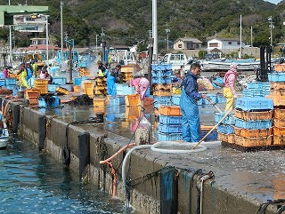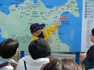 答志島・・・まずはその位置ですが、鳥羽市営定期船の鳥羽マリンターミナルから20分程度。海もここまでは内海で静か。答志島には三つの漁港(集落)があり、私たちが「上陸」したのは、「和具」。季節はワカメの収穫時期で、漁港ではワカメやメカブを茹でる湯気が私たちを迎えてくれました。現地の案内役は「つどい」で発表された浜口さん。看板に書かれた地図で本日の行程を紹介してもらいました。
