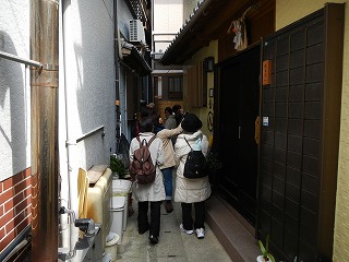 到着です、もうこの先に道はありません。家が路地の上にせり出すように建っています。屋根と屋根の隙間って数センチ(ちょっとオーバーかな?)しか空いていません。そんな風景を初めて体験しました。「どうやって家を建てるん?」「火事は絶対ダメだよね」そういう狭さでした。
