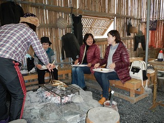路地裏散策が終わったのはお昼過ぎのこと。お腹もすいて、最後の体験として「海女小屋」で昼食を取りました。丸ごとの鯛が炭火の上で私たちを待っていてくれました。好天に恵まれたこの日、神島や伊良湖岬が思っていたよりずっと近くに見えていました。