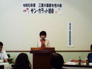 来賓としてご出席いただいた三重県農林水産部畜産課中村課長からは「畜産女性による農業高校での出前授業等畜産の啓発活動に感謝しています。畜産を取り巻く環境は、生産コストの高騰、国際情勢においても厳しい局面を迎えており、また、国内では豚コレラの発生により緊迫した状況にあります。一方で来年開催されるオリンピック・パラリンピックでは、付加価値の高い県内畜産物のPRの機会となるでしょう。レベルの高い経営管理や加工・販売等へのチャレンジは女性の活躍や観点が大事です。今後もカラット気持ちの良い活動を続けていただきたい」と祝辞をいただきました。