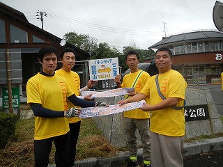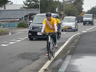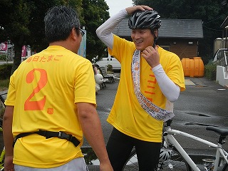12時、昔の映画なら「真昼の決闘」。西部の町へ汽笛が流れならず者たちがやってくるところだが、時は平成25年、平和な日本の10月8日ということで、やってきたのは、「和歌山たまニコチャリーダー」。場所は三重県紀宝町「ウミガメ公園」。 ご苦労様!、拍手でチャリーダーを迎えた。 沖縄からやってきた「同志」のサインで一杯のタスキを受け取った。しっかりと、受け取った。これを背負い三重県を縦走することになる。 ご苦労様、ありがとう さ、いよいよ三重県の出番だ。 |