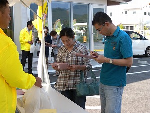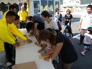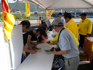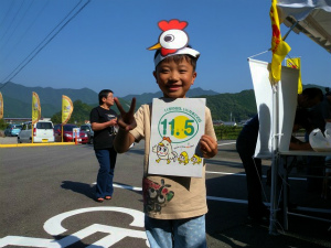 | 紀伊長島区の卵卵ふわぁ〜むで開いたタマリエ検定には、開始の10時には近在の皆さんが集まった。 タマリエ検定開始。参加の皆さんには、地元のたまごをプレゼントした。 解答を確認しながら、全問正解を喜ぶボクちゃん、タマゴ大好きと書いたうちわでにこにこちゃんのお嬢ちゃんの参加もあった。「ありがとう(^_^)v」 会場には地元の新聞社やテレビ局の取材もあり、賑やかなひと時を過ごした。 さて、きょうのチャリは、紀伊長島区から大紀町、大宮町を経て、多気のコケコッコー共和国よって亭でイベントの後、松阪市の山下鶏園泊まりというハードスケジュール。 そろそろ、スタート、10時です。「いざ、出発」 マスコミのカメラや参加の人からの声援を受けて、スタートした。 |
