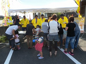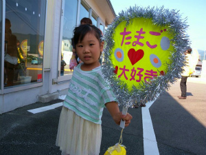 早朝から来場 地元の新聞社も取材 卵卵ふわぁ〜むへのお客様も参加 チャリーダーを応援のお嬢ちゃん 「たまごの日」を宣伝してもらいました