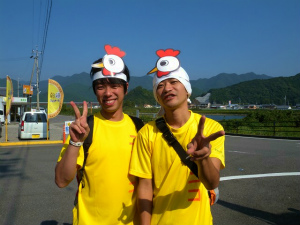 紀伊長島区は、海の町。海抜ゼロの町からいきなり距離3キロ余りで220メートルを登る厳しいステージが第一走者に与えられた。挑戦したのは、地元の垣内さん。 国道42号線のこの峠は「荷坂峠」。高度をかせぐと紀州の海がキラキラと輝き、チャリーダーに声援を送っているようだ。この日は、風も心地よかった。自転車に初挑戦のチャリーダーも若さと気力で峠を目指して、ひと漕ぎずつ一歩ずつ高度を稼いだ。約30分程の苦闘の後に荷坂峠のトップに到着。まずは、ヤレヤレ。 この峠を越えると、基本的には下り道。酪農の町、大紀町を快走する。緩やかなカーブが連続するが、チャリの楽しさも感じられる。要所々々で休憩を取りながら、チャリーダーを交替しながら、距離を伸ばしていく。玉二郎、玉三郎のスピードは、20キロ〜30キロ。 多気町のコケコッコー共和国よって亭には3時着予定。 |